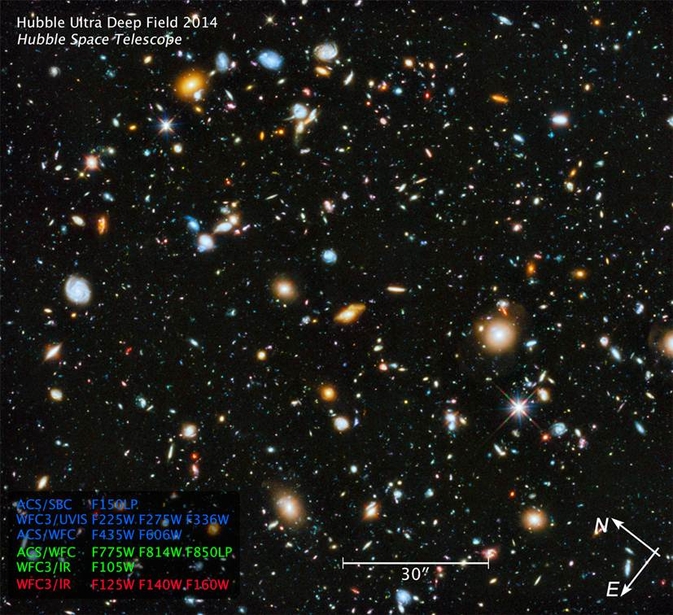 “If we look hard enough, we can actually see these distant galaxies ourselves. This image, taken by the Hubble space telescope, shows an ultra-zoomed-in view of a tiny slice of the sky, a fraction of the size of the moon. Looking this deeply into the sky revealed more than 10,000 galaxies, and because of the time it takes for their light to reach us, this photo shows some of these galaxies as they were more than 13 billion years ago — shortly after the formation of the universe.”