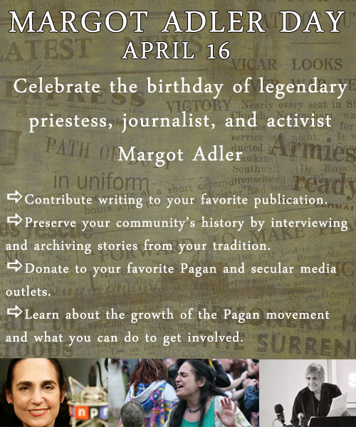 Today is Margot Adler Day. Margot Adler (April 16, 1946 – July 28, 2014) was a Wiccan priestess, NPR correspondent, and author of Drawing Down the Moon: Witches, Druids, Goddess-Worshippers, and Other Pagans in America. She was one of the most influential people in the formation of contemporary Neo-Paganism.