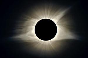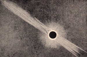 Then out upon the darkness, grewsome but sublime, flashes the glory of the incomparable corona, a silvery, soft, unearthly light, with radiant streamers, stretching at times millions of uncomprehended miles into space, while the rosy, flaming protuberances skirt the black rim of the Moon in ethereal splendor. It becomes curiously cold, dew frequently forms, and the chill is perhaps mental as well as physical.