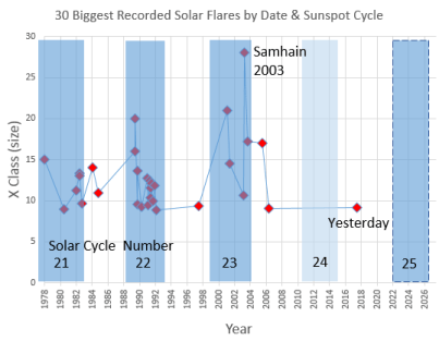 This blast is the largest since 2005, and because we are entering the middle of the low activity part of the solar cycle, it could be several years before another blast like it. However, once we get to 2022, it’s likely that another solar flare this big or bigger between 2022 and 2024. The solar activity cycle is roughly 11 years long, and the current cycle (cycle number 24) peaked around 2013 (see graph showing the biggest 30 solar flares since instruments were available in 1976). The high activity times are marked with light blue. The most recent cycle (#24) was weaker than usual (so I’ve used lighter shading for it), and didn’t produce many strong flares – hence the long gap from the last big flare until now, plus, we are already past most of the activity from cycle #24, going into the quiet time between cycles. This makes today’s CME even more of a speical gift – because, unsurprisingly, big flares are more likely during the part of the solar cycle with the most activity. Though of course some happen at other times too. Notice especially the biggest explosion, which happened around Samhain, 2003. It was actually a cluster of several flares, which were strong enough to knock out electrical grids in some areas, and produce auroras visible as far south as Texas and Florida!