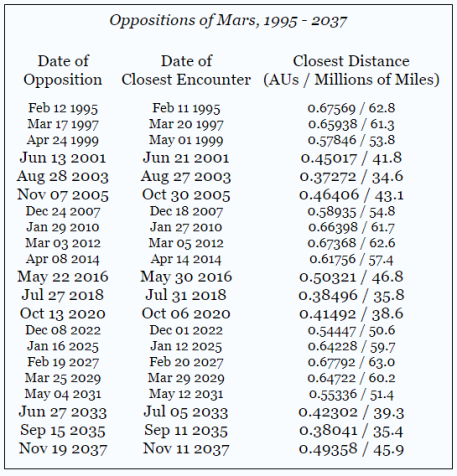 As we saw above, the Martian year is 1.88 years long – so it takes about two years for us to catch up to Mars, and go past it. But while we were going around our year, Mars also moved – so we “catch up” to Mars (and have the closest approach) at a different place than before, and hence a different day of the year. Here are the dates of Mars opposition from 1995 to 2037, from this site.