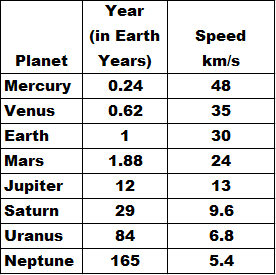 This applies everywhere, and is why the length of a planet’s year (the time to go around the Sun once) is shortest for Mercury and longer the farther one goes out from the Sun (both because the path is shorter and because the speed is higher). For another example, look at things orbiting the Earth. The space station orbits quite close in – and it goes around the Earth once in just 90 minutes. geosynchronous satellites are farther out, and hence require 24 hours to orbit the Earth, while the Moon is farther still, and takes 28 days (670 hours). This also holds for distant star systems, etc.
