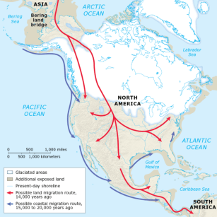 Also. all that water making up glaciers up to 2 *miles* deep means that millions of cubic miles of Earth’s seawater was locked up in the glaciers, lowering sea levels worldwide. For instance, there are caves elsewhere in the world, which humans lived in and painted, which are now only accessible by diving under water, because at the time all of the caves were above the waves (for instance, check out the Cosquer caves!). This lowering of the sea levels caused the Bering strait, between Alaska and Russia, to be dry ground. This would allow people from Asia to migrate to Alaska, but perhaps not further South (see above). As the glaciers melted starting 13,000 years ago, the resulting rising sea levels closed off the Bering strait (formerly Beringia), but for anyone in Alaska then, ice free areas opened up allowing migration South, to inhabit both North and South America! This fit well with extensive Native American evidence of inhabitation starting from around 13,000 years ago.