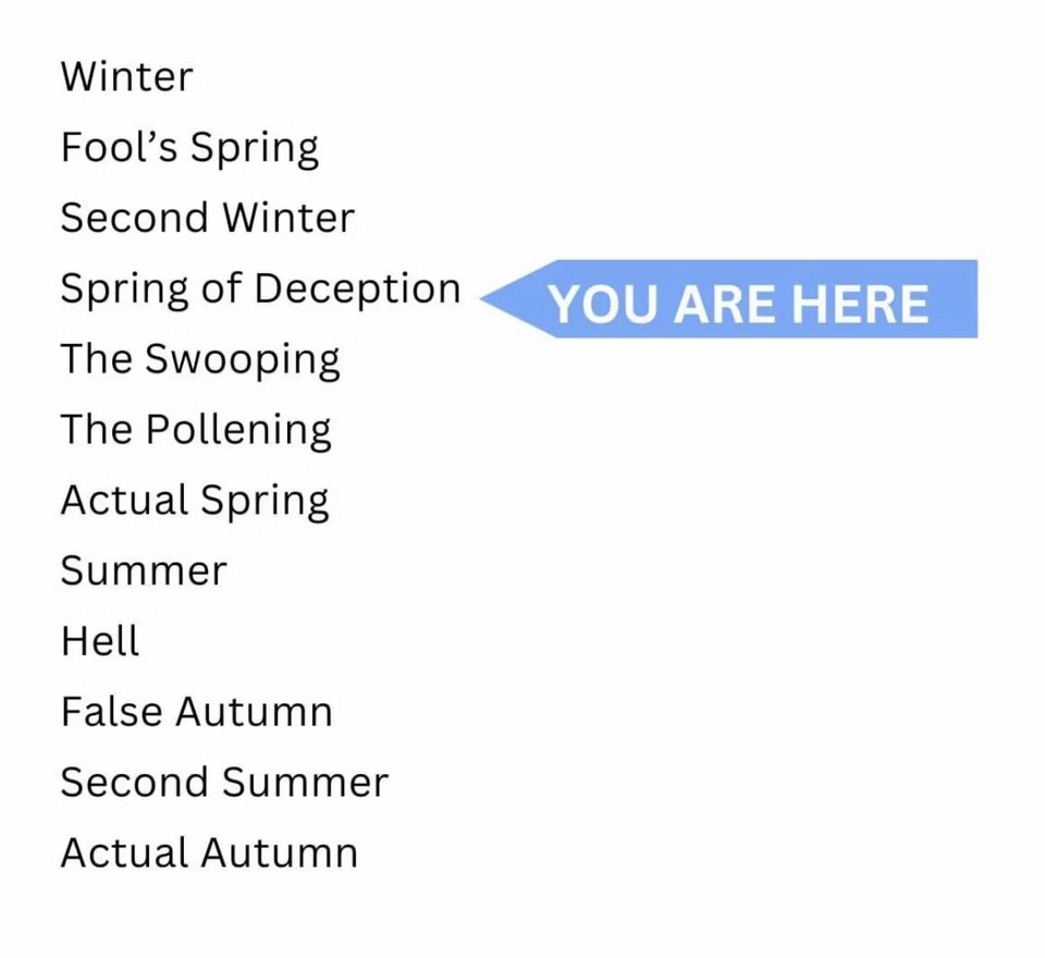 But recently I’ve realized that winter doesn’t actually stretch on in the way that I thought it did. In fact, it’s not even continuous. It ebbs and flows. I finally realized this when I came across a meme on the internet which described, not four Midwestern seasons, but twelve (or sometimes 11):